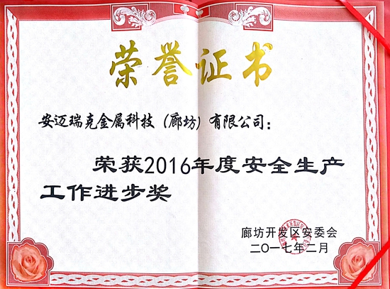 2017年2月16日,由廊坊經(jīng)濟(jì)技術(shù)開發(fā)區(qū)安全生產(chǎn)委員會主辦的2016年度全區(qū)安全生產(chǎn)表彰大會在廊坊開發(fā)區(qū)管委會舉行,我公司榮獲2016年度安全生產(chǎn)工作進(jìn)步單位。